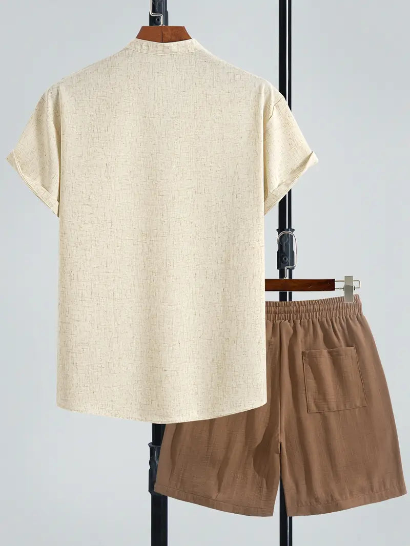 Introducing our Men’s V-Neck Linen Blend 2-Piece Set, designed for ultimate comfort and effortless style during the warmer months. This set features a half-sleeve V-neck shirt paired with drawstring waist shorts, both crafted from a breathable spandex and linen blend fabric.