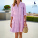 This striped linen shirt dress combines a timeless fit with laid-back charm, making it a must-have piece for warm-weather outfits. The vertical striped pattern creates a flattering silhouette, while the shirt-dress cut adds a touch of modern sophistication—perfect for city strolls, brunches, or vacation nights out.